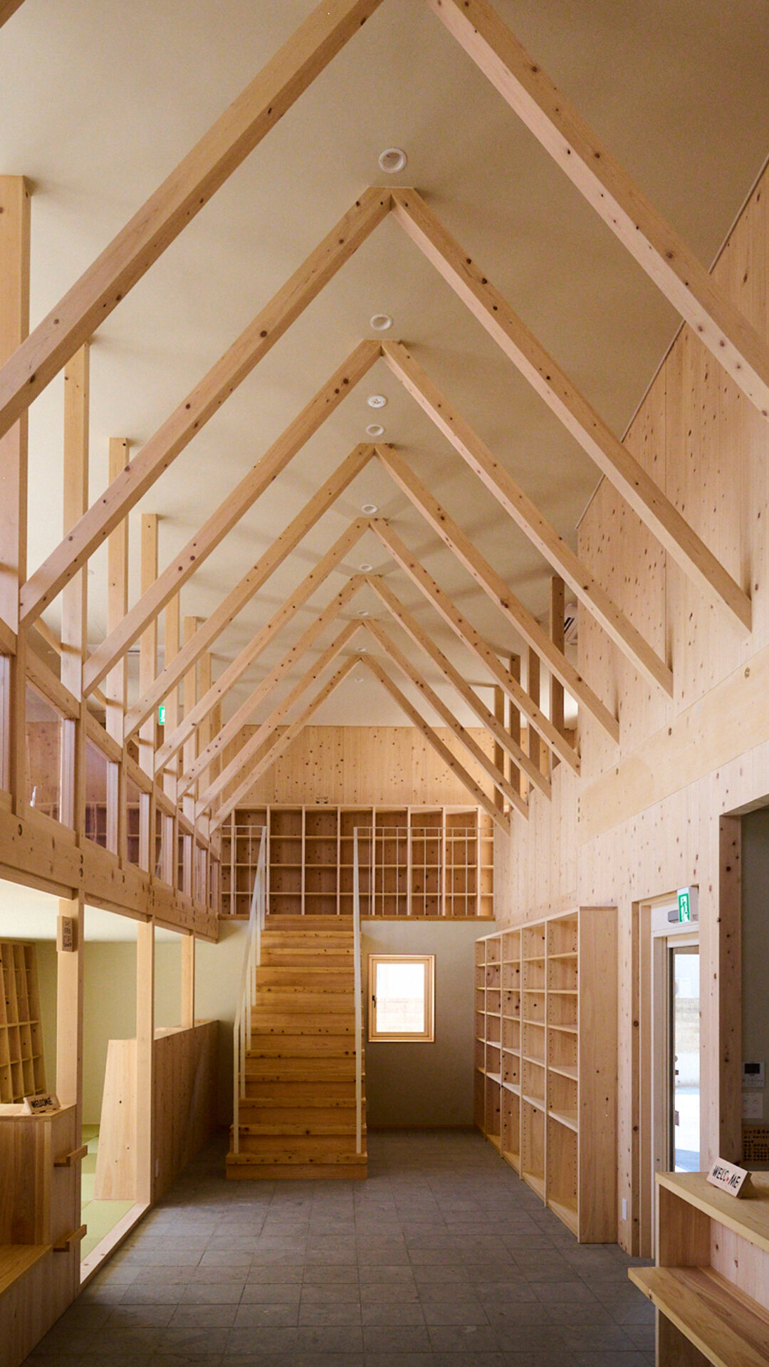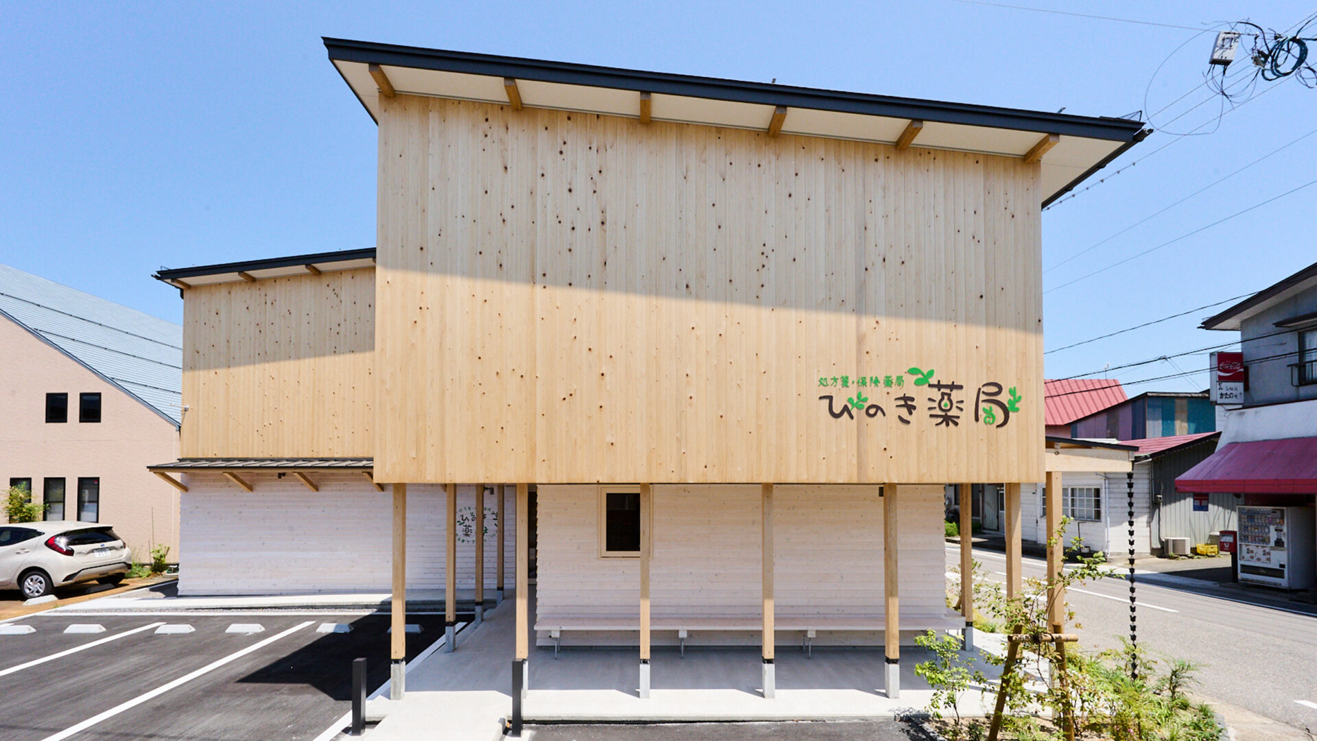 また、薬局利用者以外の方が建物を気兼ねなく利用できることを考え、建物の道路沿いに庇のある縁側空間を設けました。隣地にある駄菓子屋に来た子供達や地域の方が、自由に一休みしたり雨宿りができます。また、薬局内で使用する会議室を、地域のイベントでも利用できるオープンなつくりの多目的スペースとしました。ここには大型のキッチン設備を備えており、認定栄養ケア・ステーションの活動拠点として、常駐の管理栄養士による料理教室も行なう予定です。「ひのき薬局」は併設図書館を一体的に運営することで、地域の方と薬局とのつながりを強め、健康について気軽に相談できる調剤薬局となることを目指しました。2023年7月18日にグランドオープンしました。